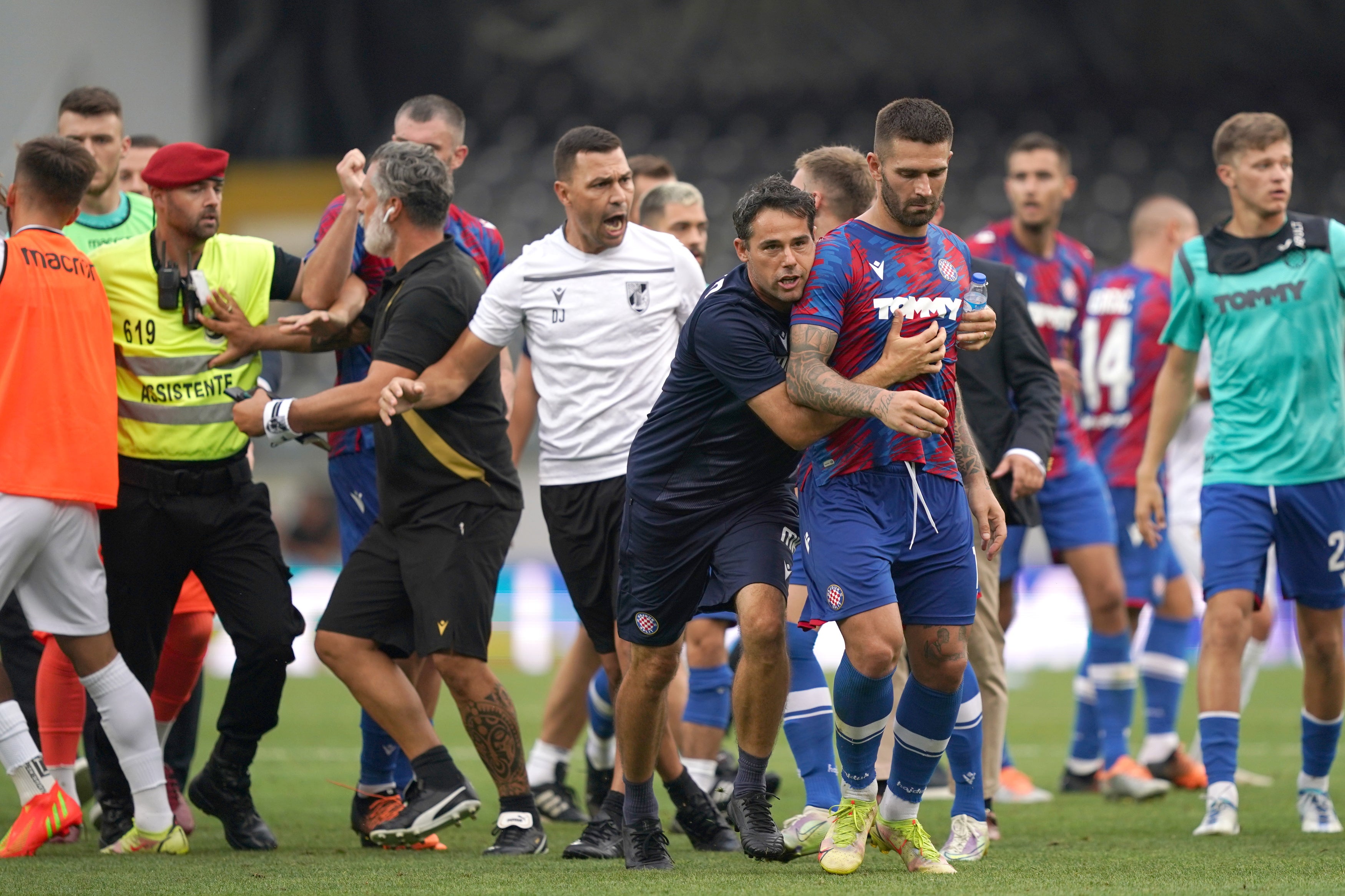 O jogo entre Vitória de Guimarães e Hajduk Split, da Liga Conferência Europa de futebol, terminou com desacatos entre jogadores, lançamentos de cadeiras por adeptos vitorianos e agressões de adeptos croatas no exterior.